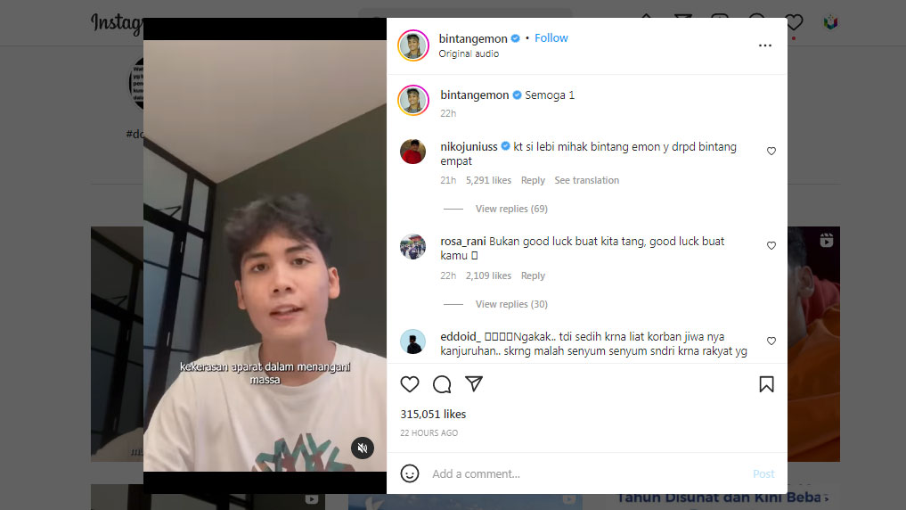 Kritik Bintang Emon tersebut disampaikan melalui postingan video di akun Instagram pribadinya @bintangemon pada Selasa, 4 Oktober 2022.