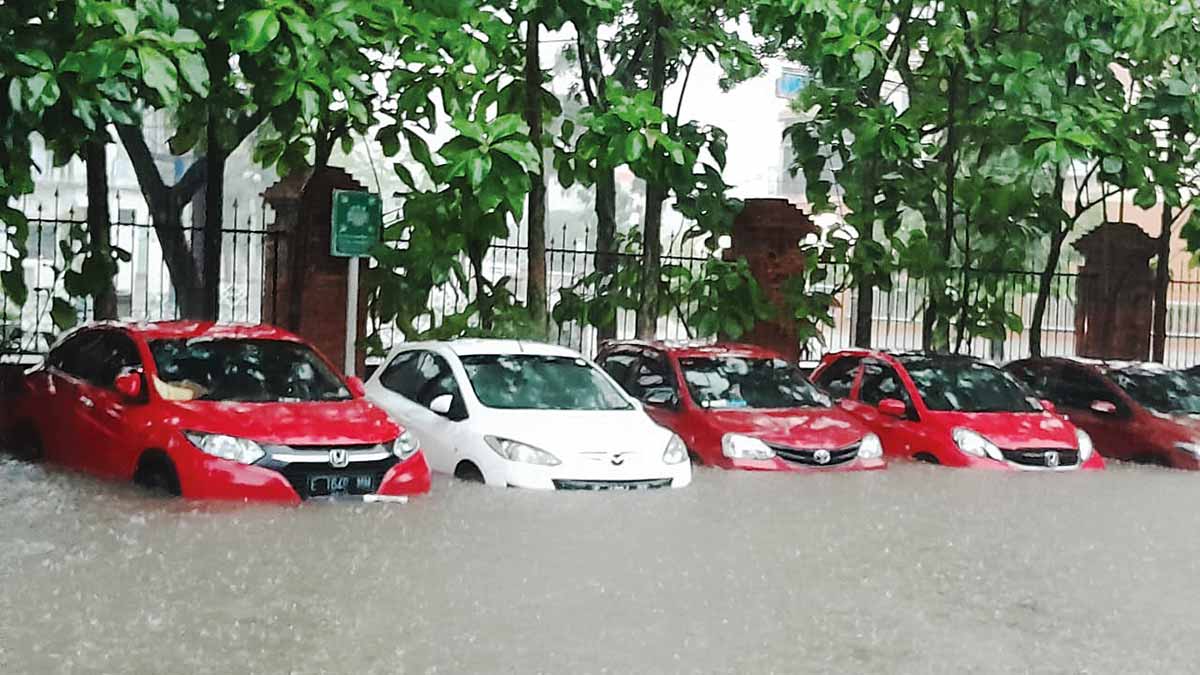 Bahkan, beberapa mobil yang terparkir di halaman salah satu kampus di jalan itu turun terendam hingga lebih dari setengah badan kendaraan.