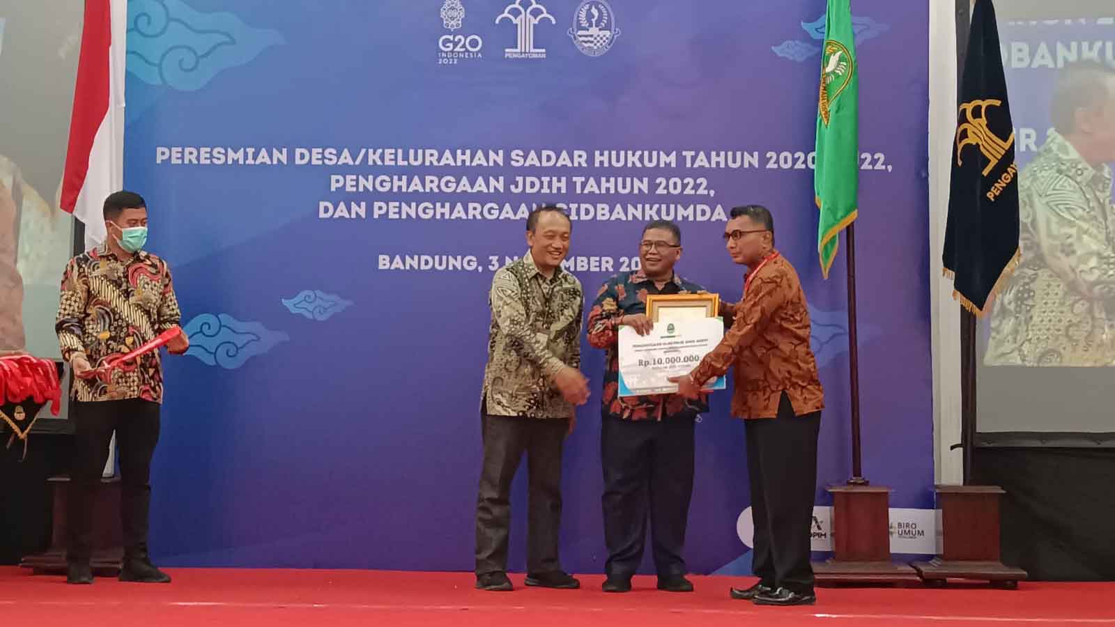 Penghargaan diberikan oleh Sekretaris BPHN Audy Murfi dan wakil Gubernur Jawa Barat Uu Ruzhanul Ulum, di Gedung Sate Bandung pada Sabtu (5/11).