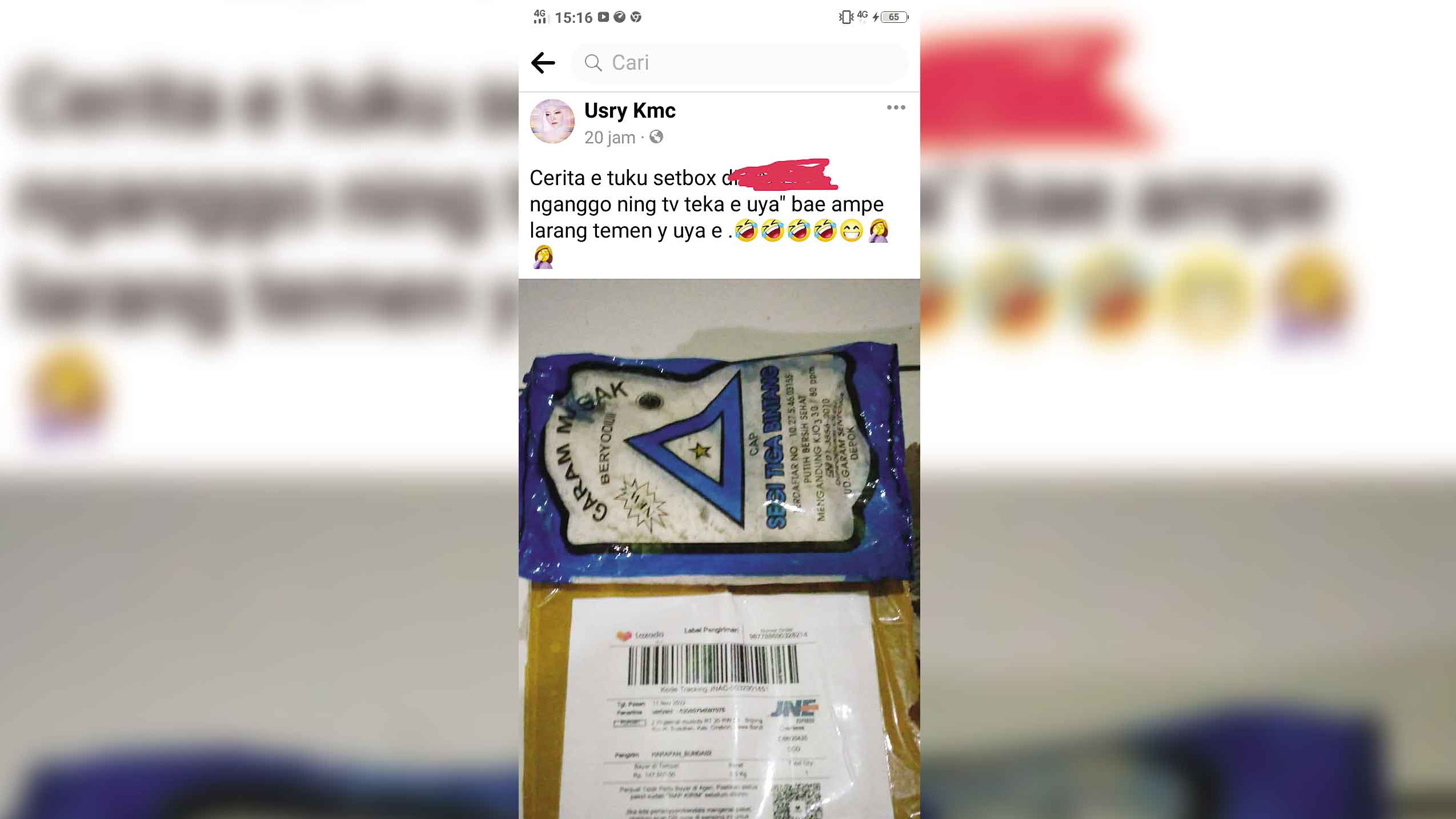 “Ceritanya beli set top box di (salah satu toko online-red) untuk dipasang di tv, ternyata yang datang hanya garam. Mahal sekali ya garam,” tulis pemilik akun facebook Usry kmc dalam bahasa Cirebon.