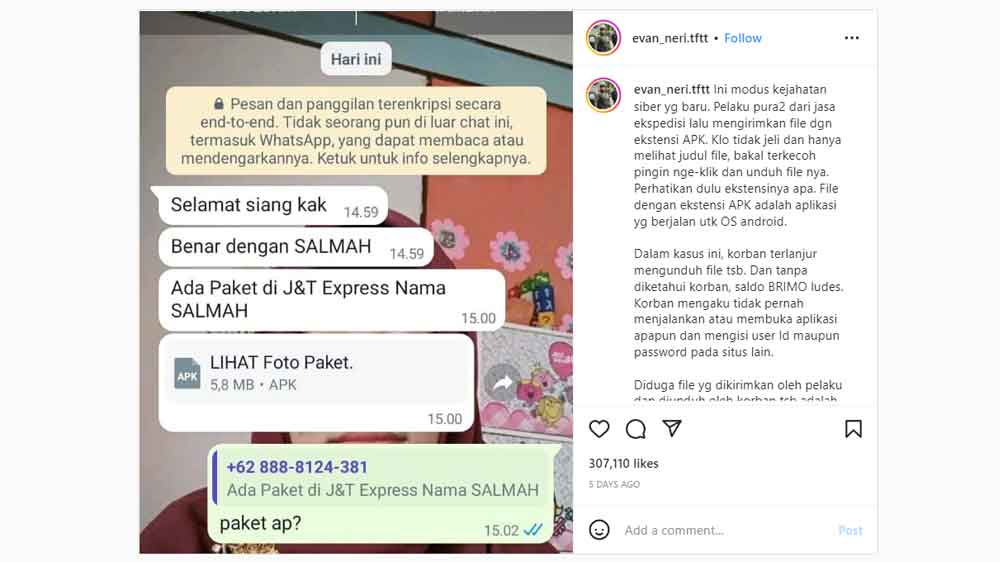 Modus penipuan baru berkedok kurir tersebut berpura-pura mengirimkan file Apk yang bertuliskan foto.