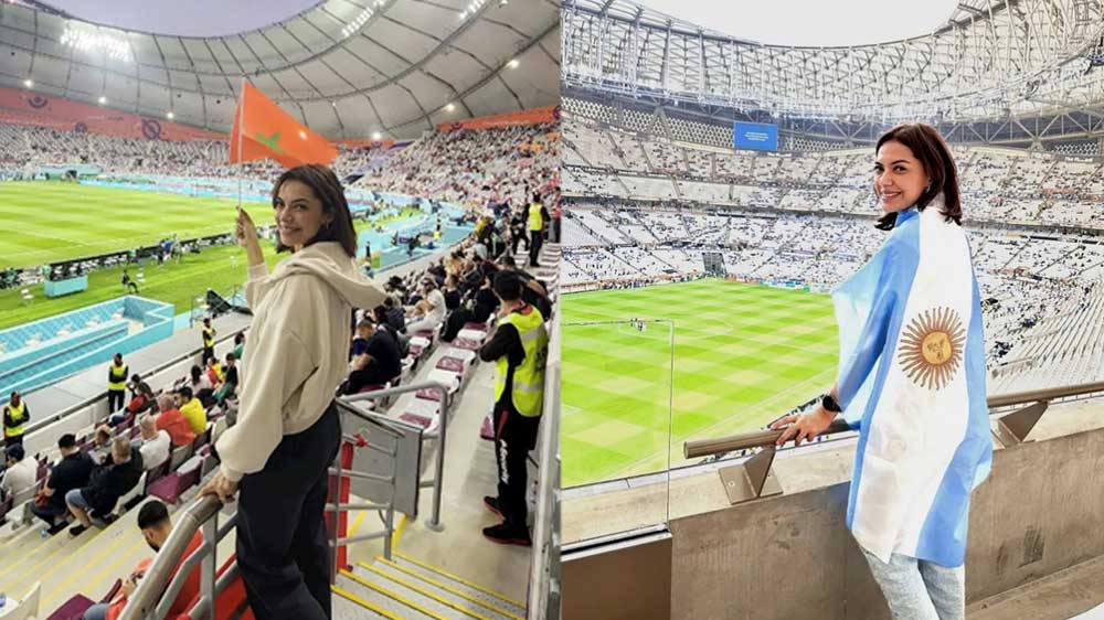 Bersepatu putih dan berkaca mata hitam, dengan membawa tas kulit warna hitam, Najwa Shihab menuju arah Stadion Lusail Qatar.