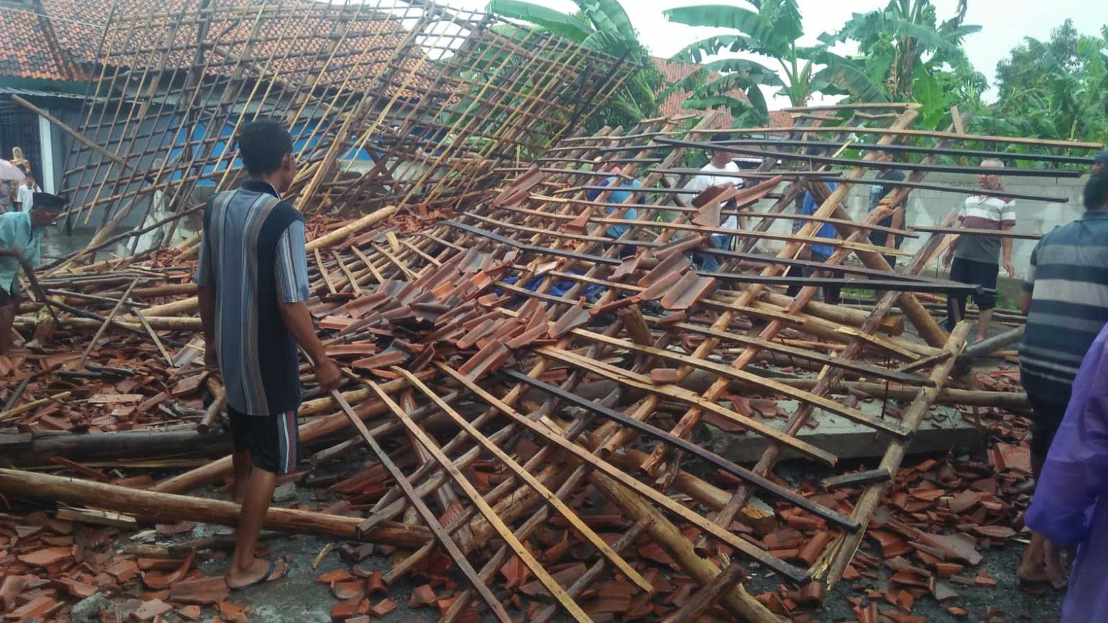 Tak hanya menumbangkan pohon, pada peristiwa hujan disertai angin kencang itu terdapat atap banguan yang ambruk hingga memakan korban.