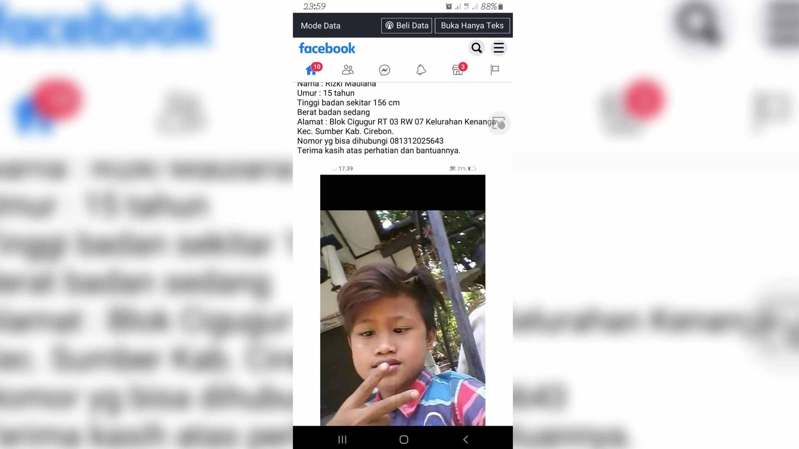 Dalam informasi anak hilang itu, disebutkan, seorang anak laki-laki bermama Rizki Maulana, pergi dari rumah, tapi sudah tiga hari tidak pulang.
