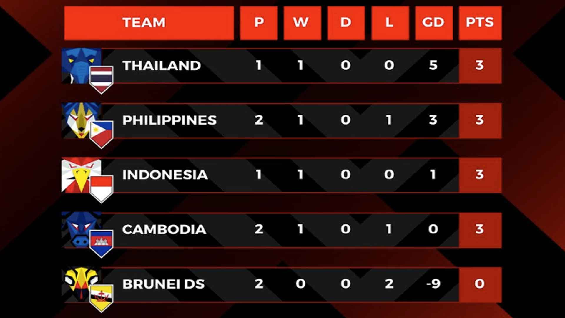 Di Grup A, kendati sama-sama meraih 3 poin, Timnas Indonesia berada di urutan ke 3 di bawah Thailand dan Filipina.
