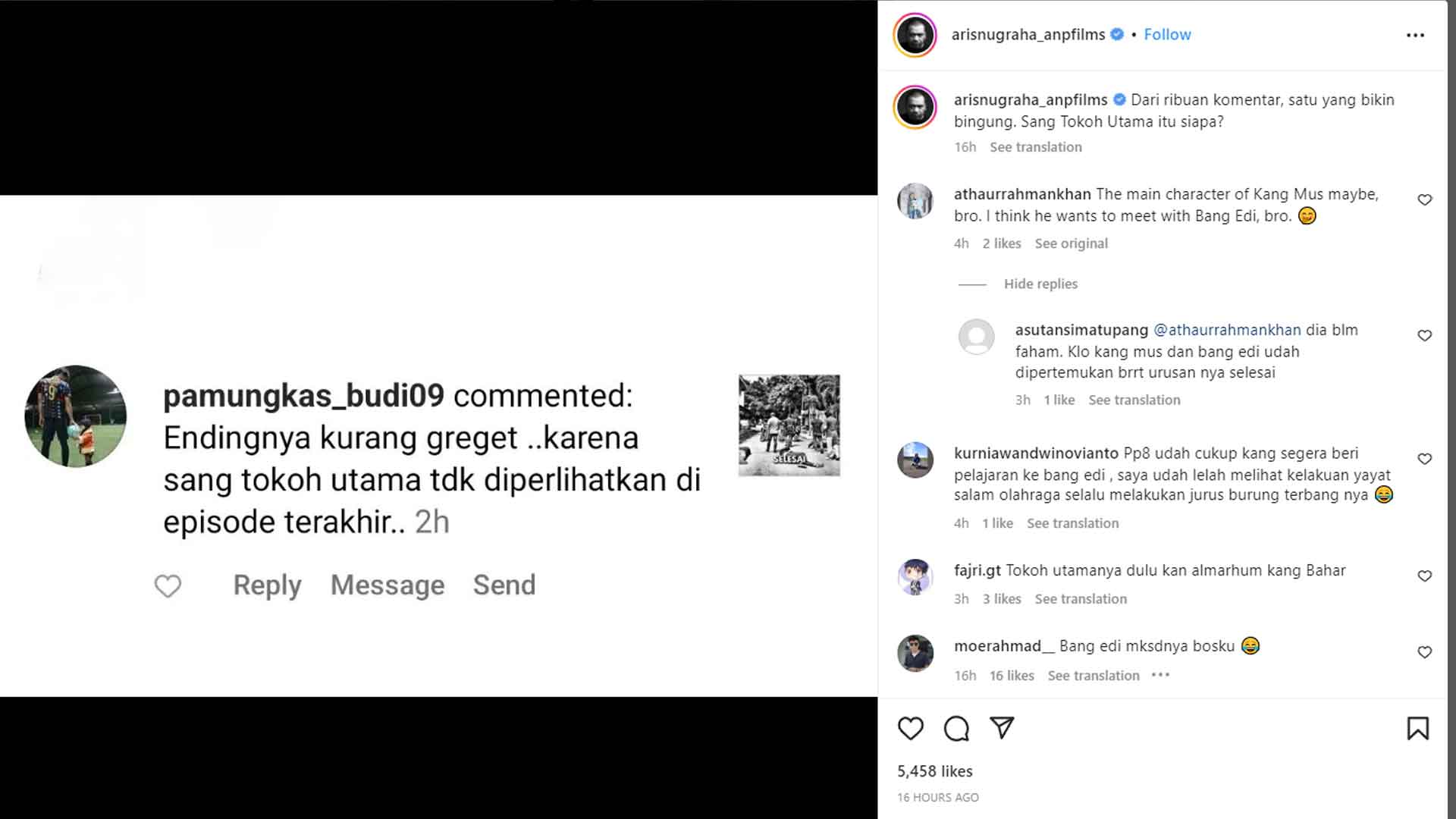 “Endingnya kurang greget ..karena sang tokoh utama tdk diperlihatkan di episode terakhir,” tulis akun Instagram @pamungkas_budi09 yang diunggah di akun Instagram @arisnugraha_anpfilms.