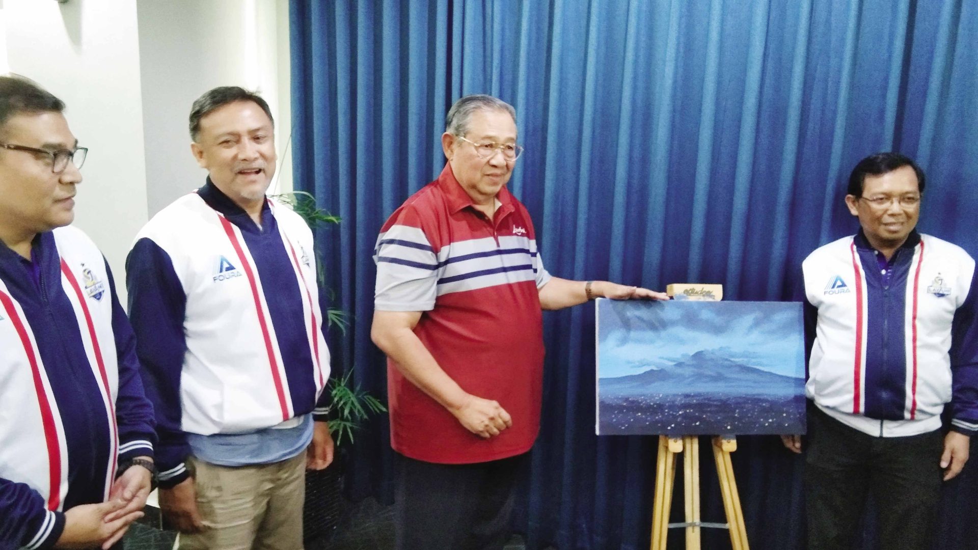 “Saya melukis habis salat Subuh, akan tetapi pas melihat dari kaca jendela, ternyata keadaan masih cukup gelap. Lalu tepat pukul 05.30, akhirnya saya bisa melukis suasana Gunung Ciremai yang indah,” ujar SBY.