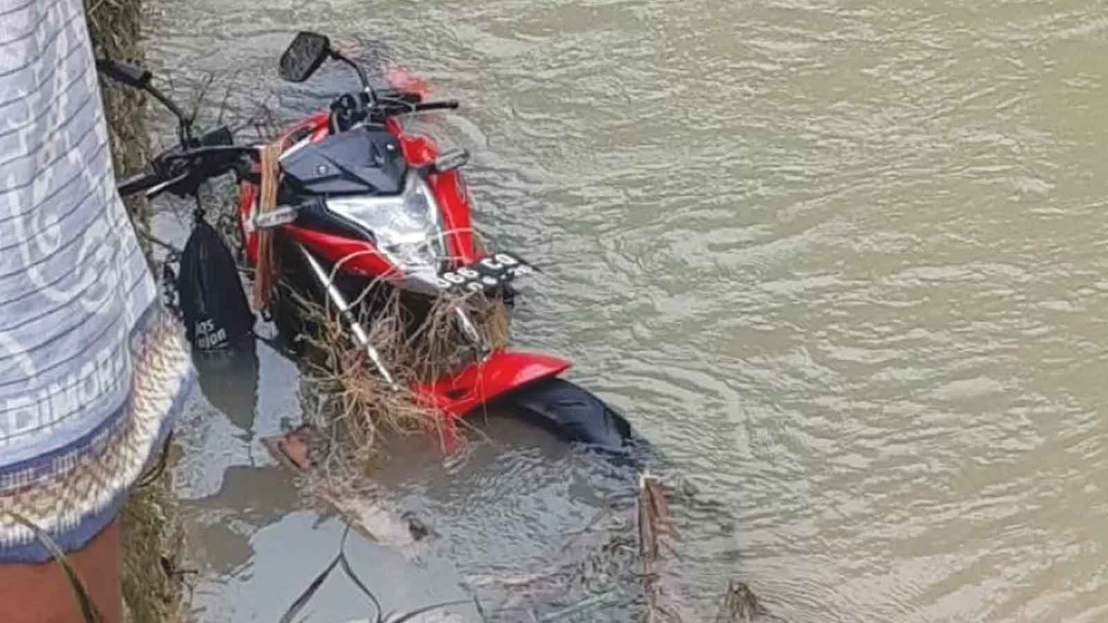 Sebelum mayat korban, warga lebih dulu menemukan sepeda motornya. Sebuah sepeda motor merah ditemukan di dalam sungai tersangkut di bawah jembatan.