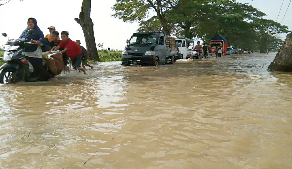Bahkan hingga pukul 09.00 WIB, air masih merendam ruas jalan Arjawinangun-Gegesik dengan ketinggian mencapai lutut orang dewasa.
