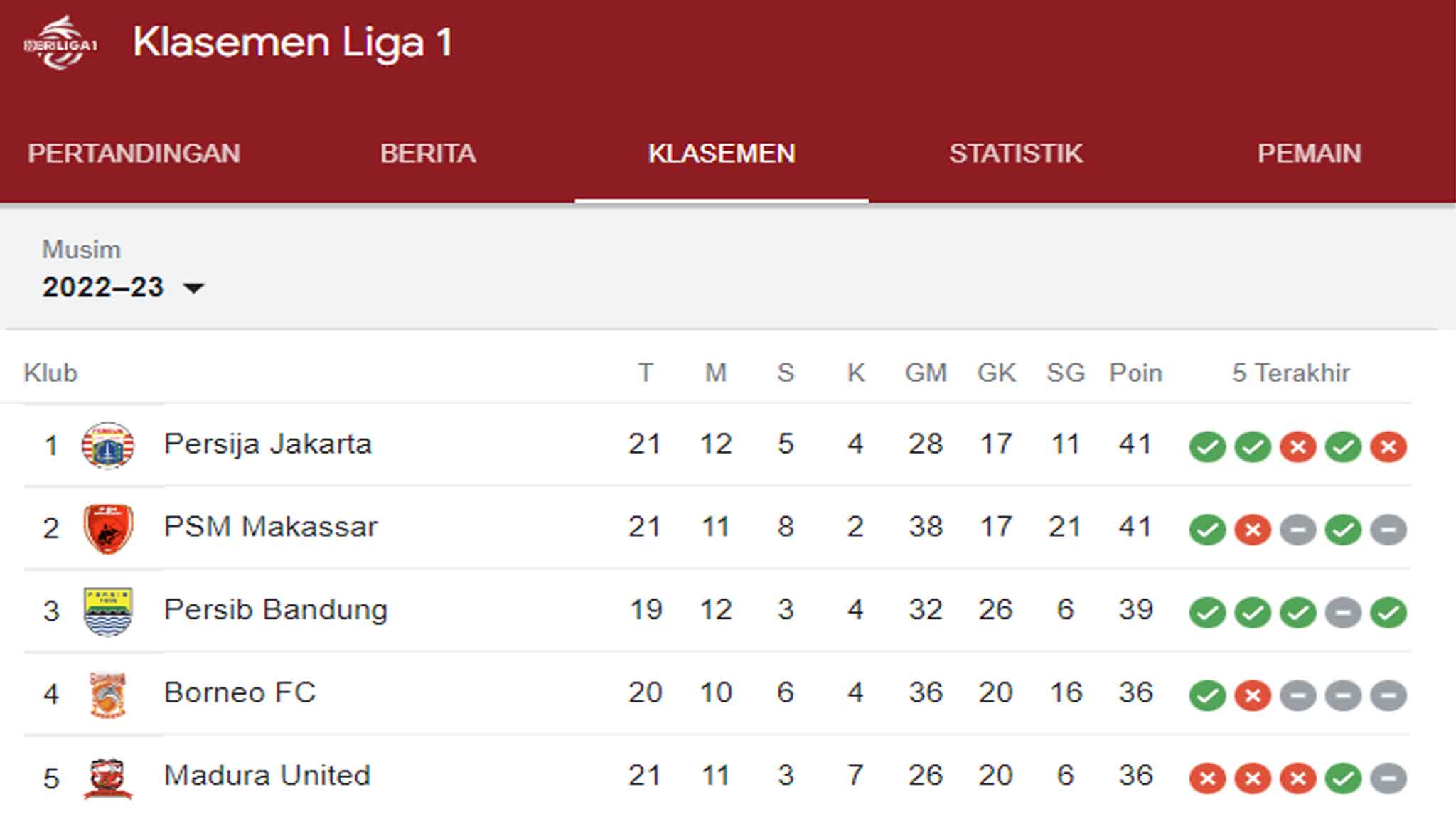 Terlihat dari papan klasemen sementara BRI Liga 1 yang kini memasuki pekan ke 21. Persija dan PSM Makasar berada di posisi puncak dan runner up, namun memperoleh poin sama 39.