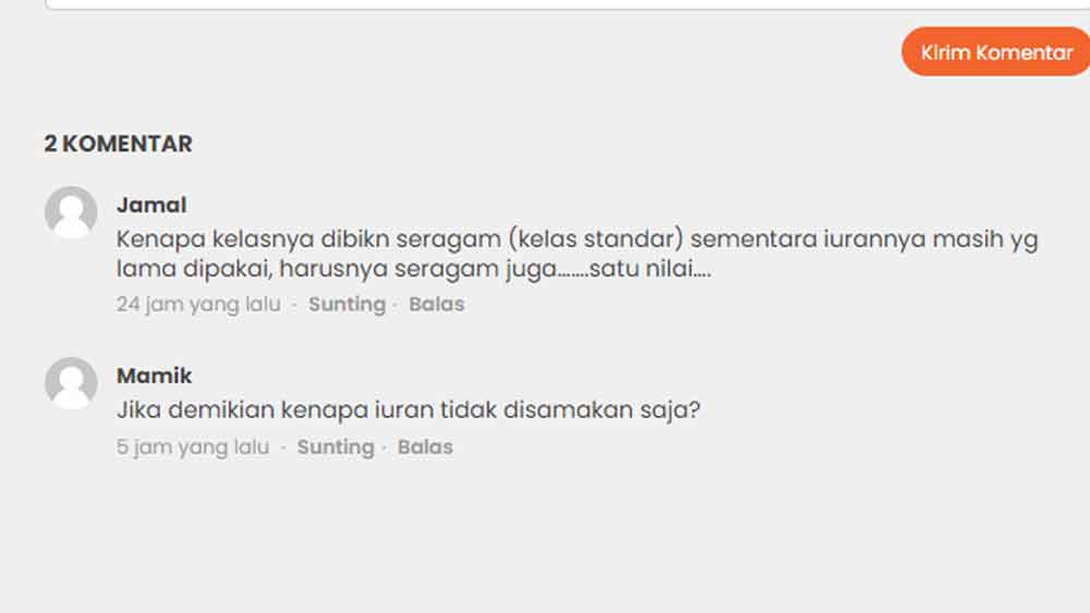 “Kenapa kelasnya dibikn seragam (kelas standar) sementara iurannya masih yg lama dipakai, harusnya seragam juga…….satu nilai….,” tulis Jamal di kolom komentar suaracirebon.com, Minggu, 12 Februari 2023.