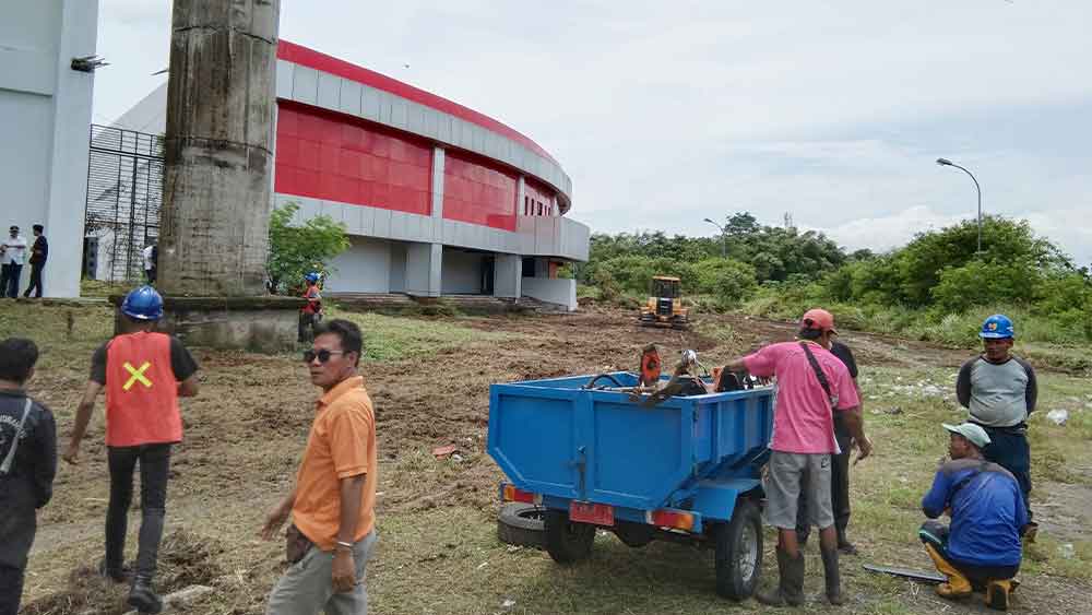 Rumput dan tanaman liar yang memenuhi halaman Stadion Watubelah mulai dibersihkan pada Rabu, 22 Februari 2023.