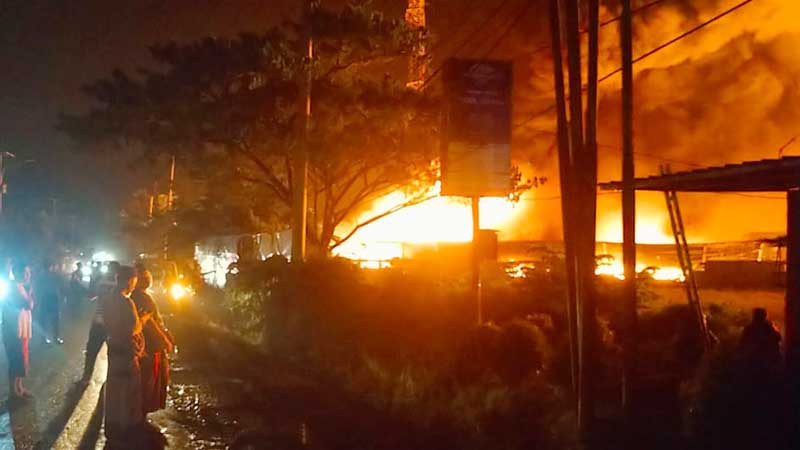 SUARA CIREBON – Api masih berkobar membakar pabrik kasur di Desa Kebonturi, Kecamatan Arjawinangun, Kabupaten Cirebon, Senin malam ini, 27 Februari 2023.