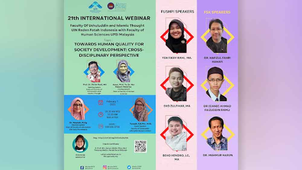 Oleh karena itu, IAIN Cirebon mengundang para mahasiswa, dosen dan peneliti untuk bergabung melalui platform online (Zoom Cloud Meetings), hari Rabu, 1 Februari 2023 pukul 09.30 WIB (Indonesia) / 10.30 (Malaysia) dalam Webinar Internasional Series ke-21 Kerjasama Fakultas Ushuluddin dan Pemikiran Islam UIN RF Palembang dengan Fakulty Sain dan Kemanusiaan UPSI Malaysia dengan tema: “Towards Human Quality for Society Development: Cross-Disciplinary Perspective” – (Menuju Kualitas Manusia untuk Pembangunan Masyarakat: Perspektif Lintas Disiplin)