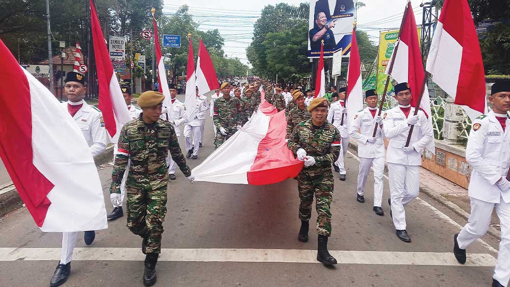 Di leher atau kepala para peserta kirab itu terpasang kacu merah putih. Sementara ribuan pelajar berjejer di pinggir jalan menyambutnya dengan bendera merah putih.