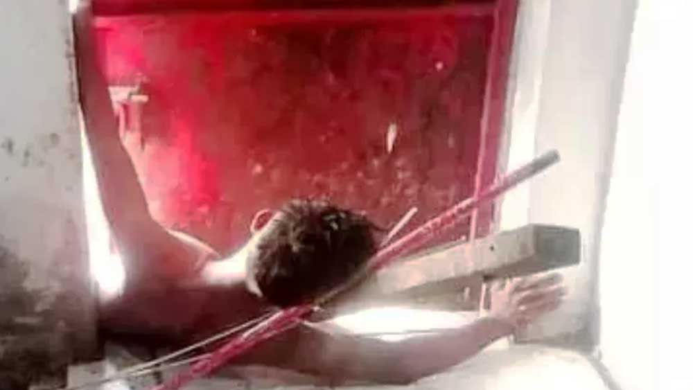 Maling yang sial ini sebelumnya tertimpa balok kayu saat hendak membuka pintu besi. Namun balok kayu malah menimpa tubuhnya saat hendak masuk.