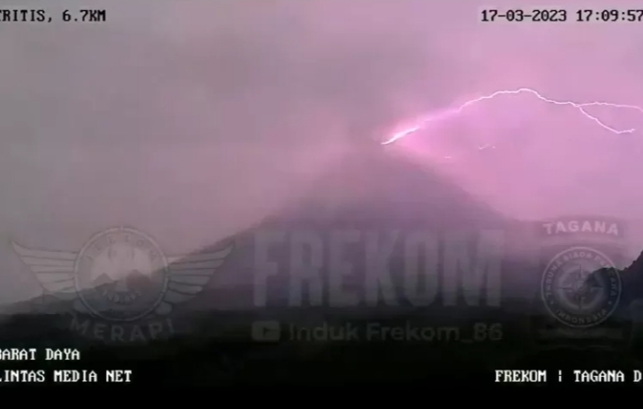 Terlihat dalam video rekaman CCTV, dari puncak Merapi melontarkan sambaran petir yang sangat mengerikan sebanyak empat kali dalam tiga detik.