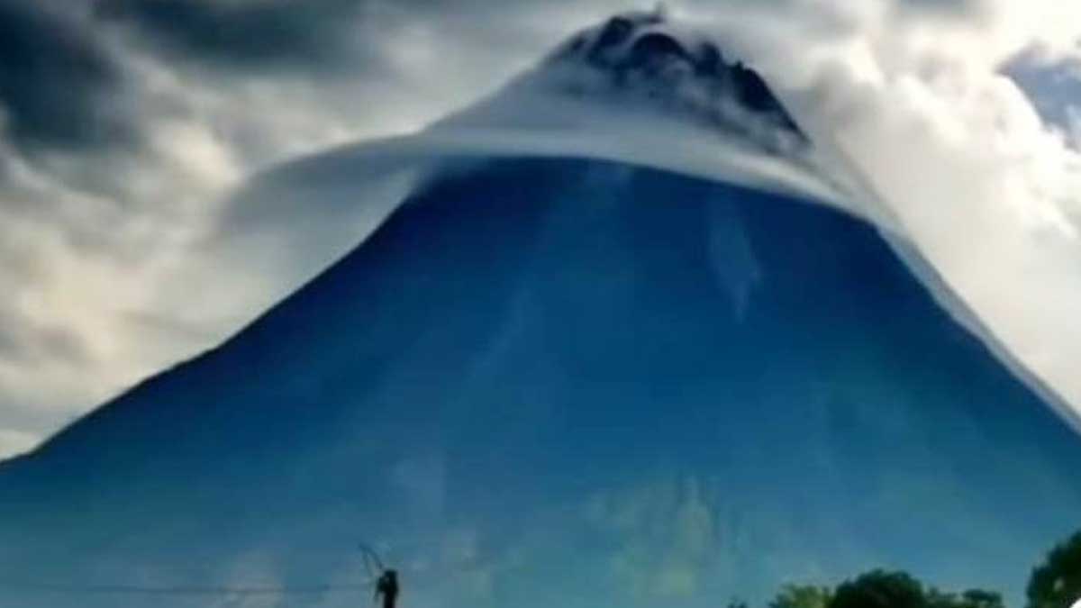 Terlihat Gunung Merapi yang terletak di perbatasan Jawa Tengah dan Daerah istimewa Yogyarakta ini seperti memakai caping atau topi petani.