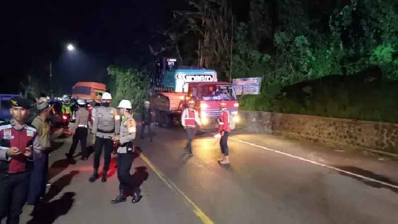 Terlihat petugas dari jajaran Polres Sumedang, unsur TNI, Perhutani, aparat desa, kecamatan, BPBD dan masyarakat berupaya membersihkan jalan raya itu dari material longsor.