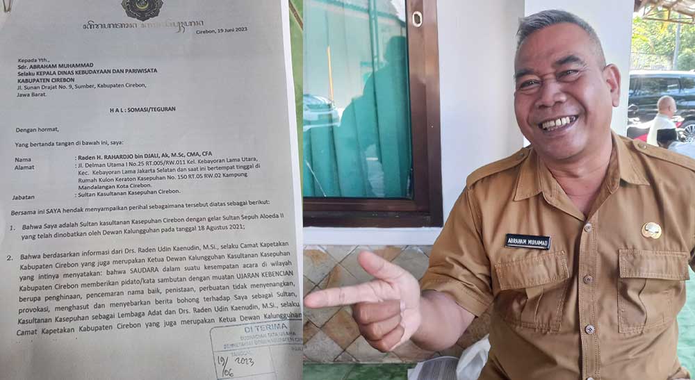 Abraham mendapat somasi atau teguran dari Sultan Sepuh Aloeda II Kasultanan Kasepuhan Cirebon, Raden H Rahardjo bin Djali yang dikirimkan langsung ke kantor Disbudpar Kabupaten Cirebon pada Senin, 19 Juni 2023 ini.