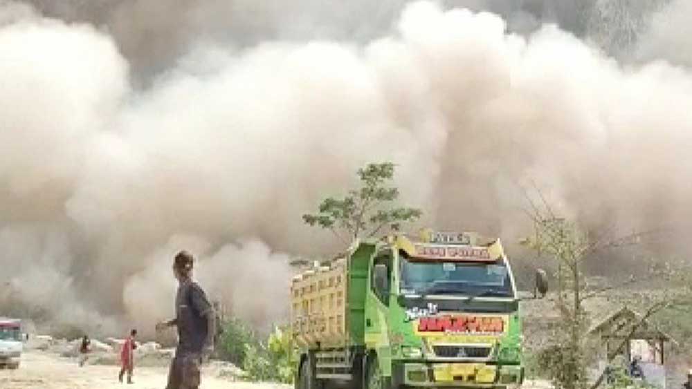 Dalam video tersebut tampak sejumlah sopir truk yang ada di bawah sekitar longsoran bergegas membawa kendaraannya menjauh, karena debu yang ditimbulkan dari longsoran nampak menyembur ke arah mereka.