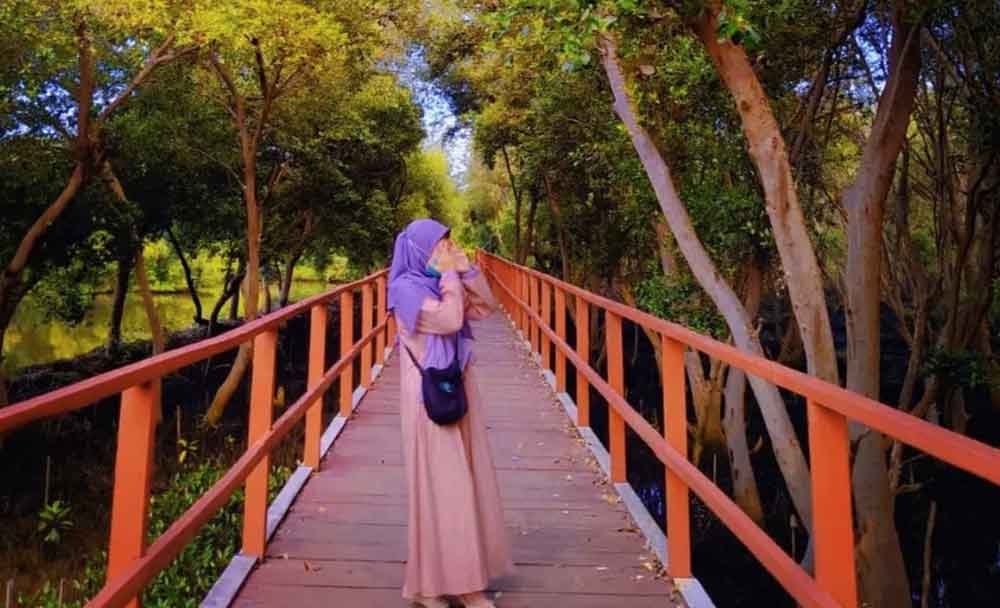Ada sensasi melewati jembatan kayu dan anyaman bambu menerobos masuk ke kedalaman hutan mangrove yang sangat rimbun.