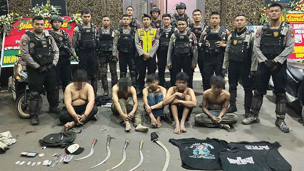 Petugas langsung mengamankan para terduga pelaku tersebut berikut barang bukti berupa lima senjata tajam (sajam) jenis celurit panjang, obat keras terbatas jenis Trihexypenidyl, handphone, dan lainnya.