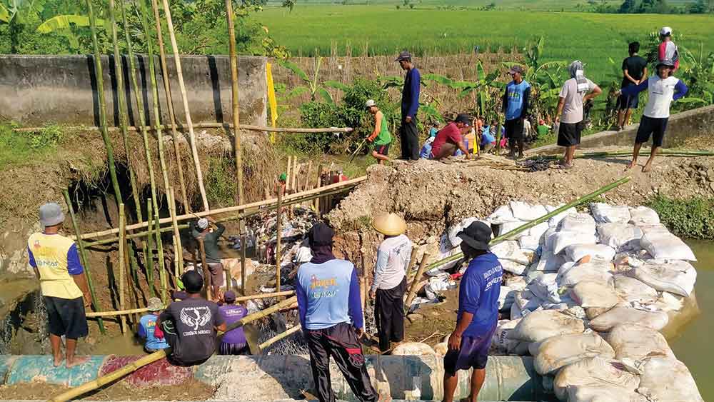Pihaknya bersama beberapa kuwu dan raksa bumi dari sejumlah desa telah menambal tanggul jebol tersebut, sebagai upaya darurat. Namun, penambalan yang dilakukan dengan cara manual itu tidak efektif dalam memperbaiki tanggul irigasi induk yang jebol.