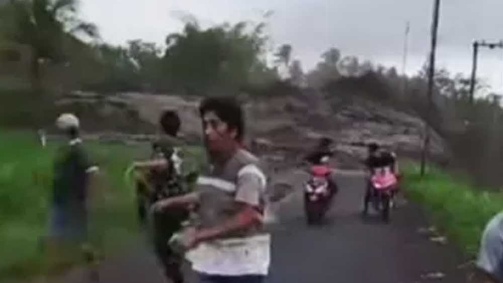 Terlihat terjangan banjir dengan kecepatan tinggi menerjang sebuah jalan desa. Membuat warga yang melewati jalan terpaksa berbalik arah dan kabur menjauhi terjangan banjir mirip gelombang tsunami.