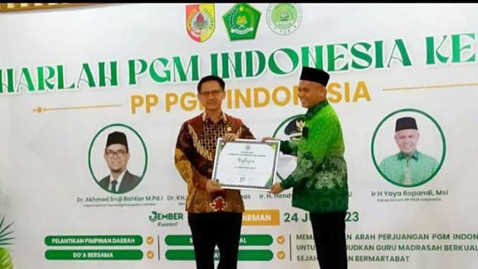 Penyerahan penghargaan dilakukan dalam acara Harlah PGMI ke-15 di Kabupaten Jember, Jawa Timur, Senin, 24 Juli 2023. Penghargaan dari PGMI diwakili oleh Staf Ahli Bupati Bidang Ekonomi, Pembangunan dan Keuangan, H. Wawan Sarwanto.