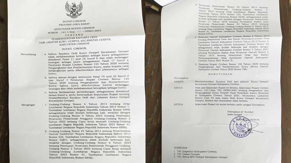 SUARA CIREBON – Pemerintah Kabupaten Cirebon akhirnya resmi memberhentikan Kuwu Gempol, Kecamatan Gempol, Dedi dari jabatannya. Pemberhentian Kuwu tersebut tertuang dalam SK Bupati Cirebon nomor: 141.1/Kep.675-DPMD/2023 tentang pemberhentian Dedi dari jabatannya sebagai Kuwu Gempol per tanggal 5 Juli 2023.