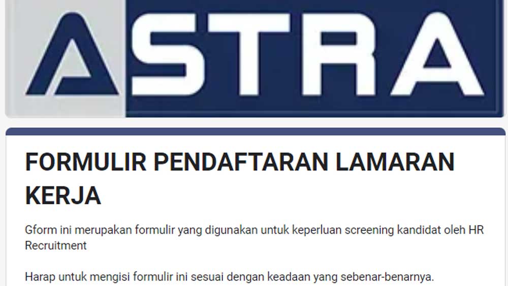 Berikut alokasi lowongan kerja (loker) di PT Astra Group, terbuka untuk pemuda dan pemudi berusia minimal 18 tahun.