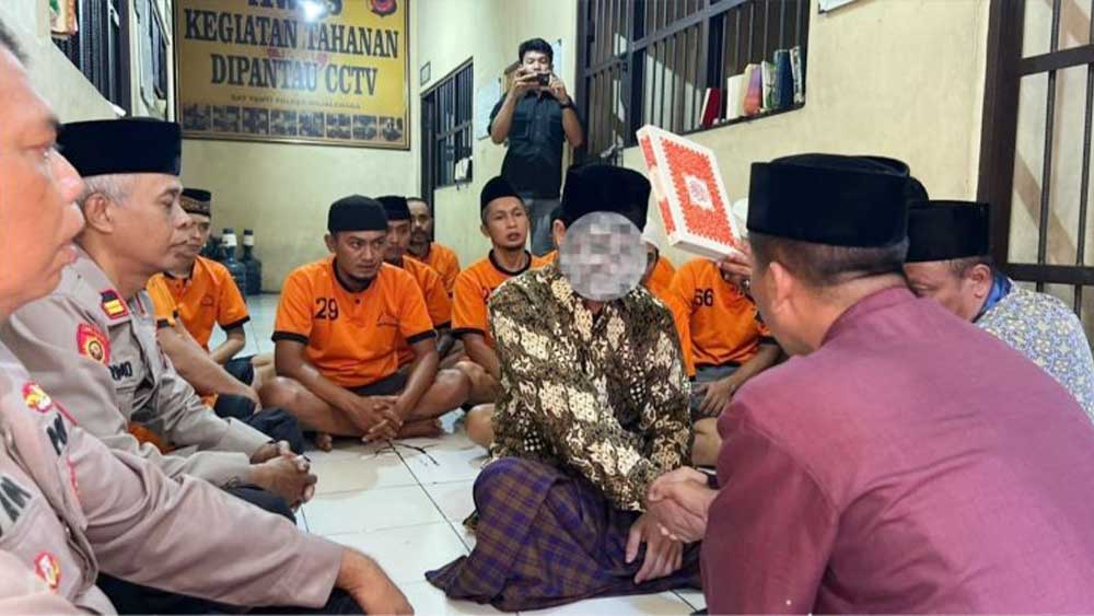 Momen mengharukan di dalam tahanan Polres Majalengka disaksikan Kasat Tahti Polres Majalengka, IPTU Suparmo, Kasubsi PIDM Sie Humas IPTU Supriyadi, anggota Sat Tahti, serta beberapa tahanan Polres Majalengka.