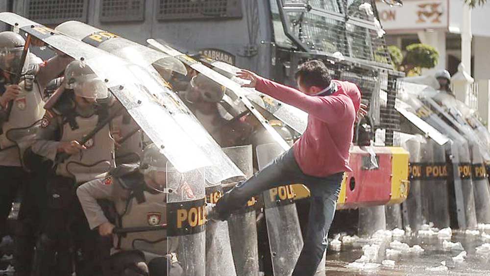 Kemudian, saat unjuk rasa itu diwarnai dengan teriakan dan pelemparan ke arah petugas pengamanan sehingga situasinya masuk ke indikator kuning.