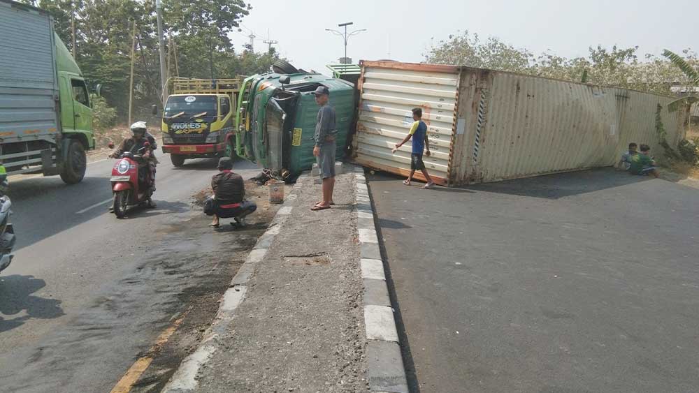 Truk tersebut terguling hingga menutup jalan usai menabrak median jalan di lokasi tersebut. Informasi terhimpun menyebutkan, peristiwa itu terjadi sekira pukul 05.00 WIB.