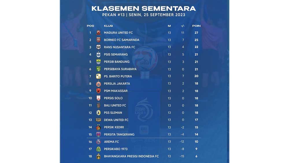 Kendati gagal meraih poin penuh di pekan ke 13 kemarin, Madura United masih kokoh di puncak klasemen dengan 17 poin.