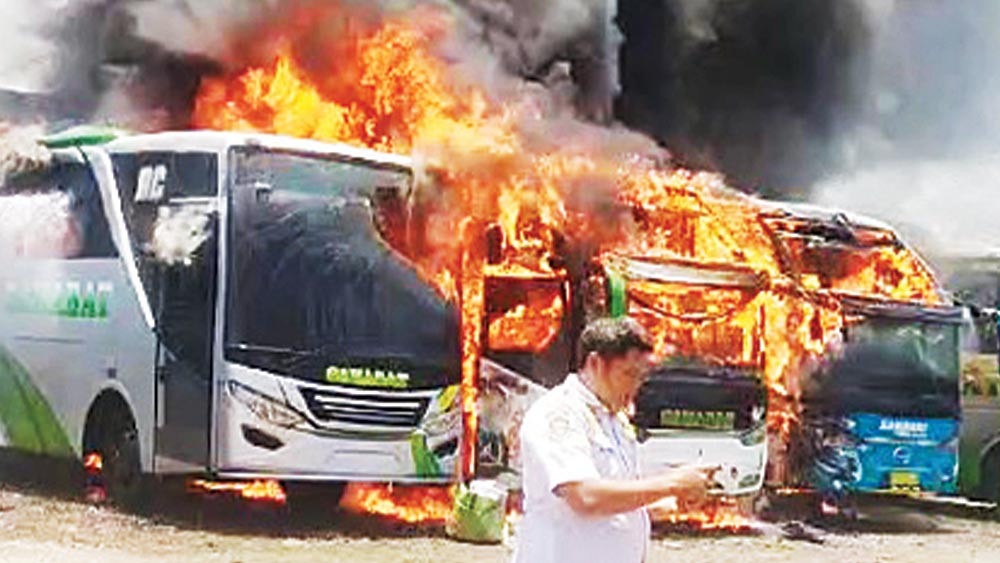 “Ada lima bus yang terbakar, dua di antaranya hangus dan tiga bus terbakar hingga 80 persen,” terangnya.