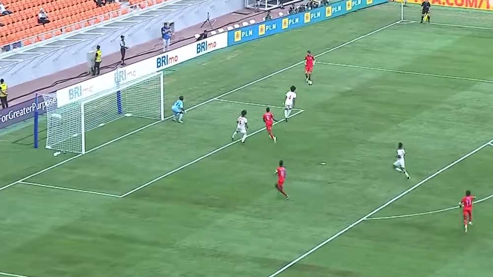 Pertahanan Kaledonia baru mulai terkoyak saat menerima sanksi tendangan pinalti akibat pelanggaran di kotak pinalti.