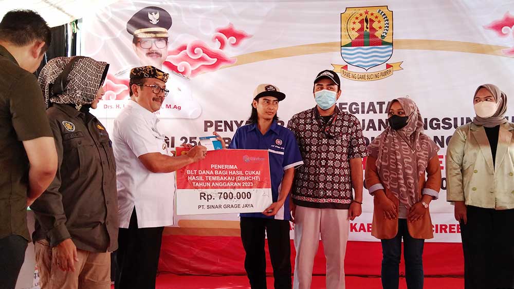 Hal itu disampaikan Bupati Imron saat menyalurkan Bantuan Langsung Tunai (BLT) kepada 2.545 buruh pabrik PT Sinar Grage Jaya (SGJ) Desa Kasugengan Lor, Kecamatan Depok, Kabupaten Cirebon dari Dana Bagi Hasil Cukai Hasil Tembakau (DBHCHT) tahun anggaran 2023, Rabu, 22 November 2023.