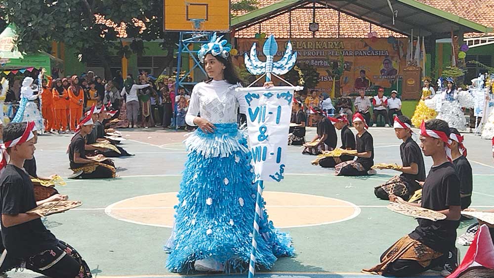 SUARA CIREBON – SMPN 1 Weru, Kabupaten Cirebon mengimplementasikan Projects Penguatan Profil Pelajar Pancasila Kurikulum Merdeka, sekaligus memanfaatkan limbah sampah plastik dan kertas untuk aksesoris pentas seni dan Bazar P5 dengan tema “Gaya Hidup Berkelanjutan”, Sabtu, 16 Desember 2023.