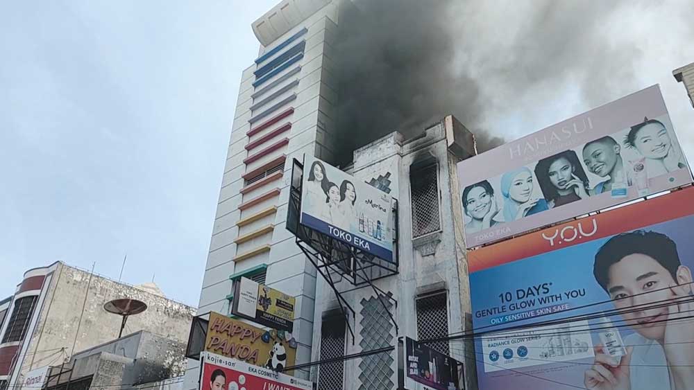 Tampak asap hitam mengepul tinggi pada bagian atas bangunan 3 lantai tersebut. Petugas pemadam kebakaran bergegas berjibaku memadamkan api pada bagian lantai 3 yang terbakar tersebut.
