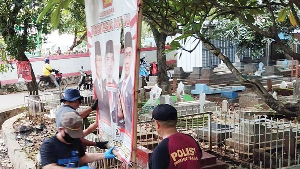 “Hari ini kami, Bawaslu Kota berikut jajaran Panwaslu Kecamatan Harjamukti, bersama Satpol PP melakukan pembersihan APK yang dipasang di area pemakaman atau TPU Kemlaten,” kata Fajri, di sela penertiban.