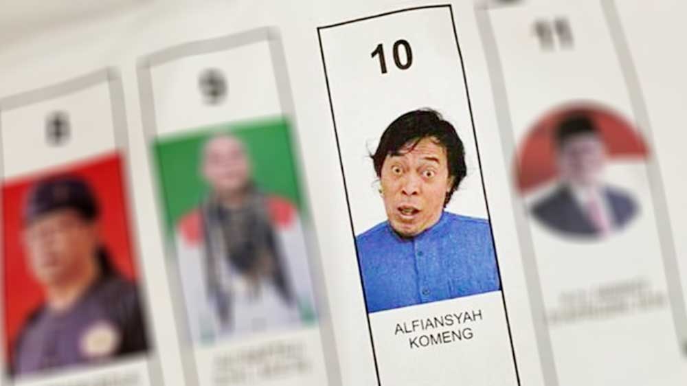 Di surat suara, foto kocak Komeng terlihat menonjol. Memakai kemeja biru, kedua matanya melotot dengan mulut terbuka dan kepala miring sedikit ke kanan.