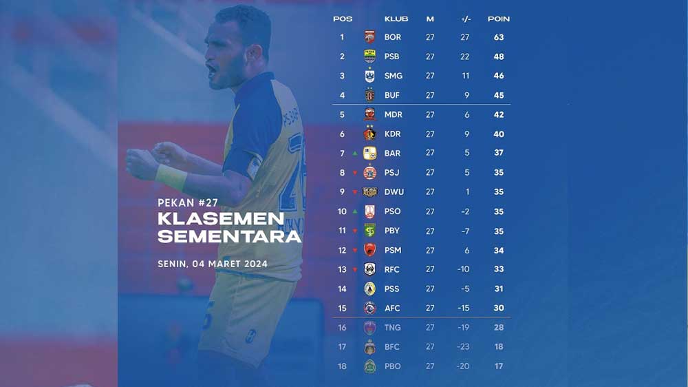 Di papan atas, Borneo FC makin tak terkejar di posisi puncak dengan 63 poin. Persib lebih kokoh di posisi runner dengan 48 poin, setelah Bali United tergelincir karena kalah dari Barito Putera.