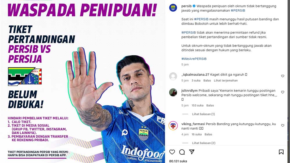 “Waspadai penipuan. Sampai hari ini (Rabu 6 Maret 2024), Persib belum membuka tiket penjualan online laga klasik lawan Persija,” tutur Vice President Operational PT Persib Bandung Bermartabat (PT PBB), Andang Ruhiat.
