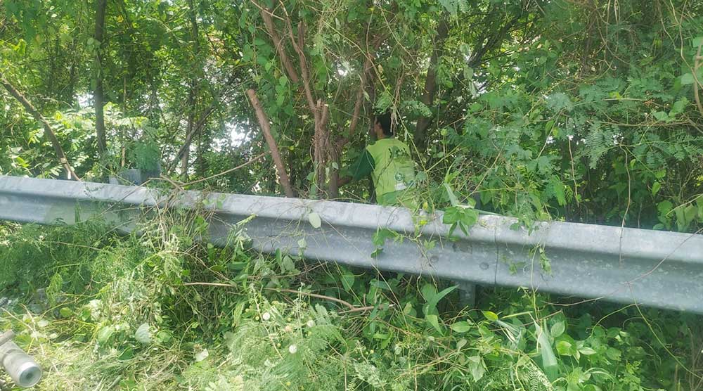 Pemdes Megu Gede bersama warga membersihkan sampah liar, rumput dan menebang ranting pohon yang mengganggu pengguna jalandi Blok Kligung.