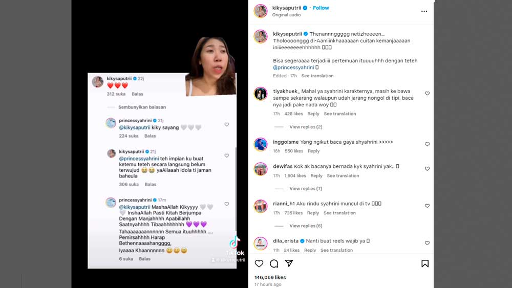 “Thenannnnggg nethizeeeen tholooonggg di-Aamiiinkhaaaan cuitan kemanjaaaaan iniiieeeeeehhhhhh (emoji menangis). Bisa segeraaaaa terjadiiii pertemuan ituuuuhhhh dengan teteh @princessyshrini”, tulis Kiky Saputri.