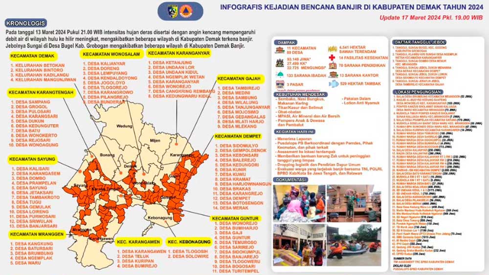 Laporan Pusat Pengendalian Operasi (Pusdalops) Badan Penanggulangan Bencana Daerah (BPBD) Kabupaten Demak, sampai Senin 18 Maret 2024, banjir merendam 89 desa, meliputi 11 kecamatan di Demak yang merupakan wilayah pantai uara (pantura) Jateng.