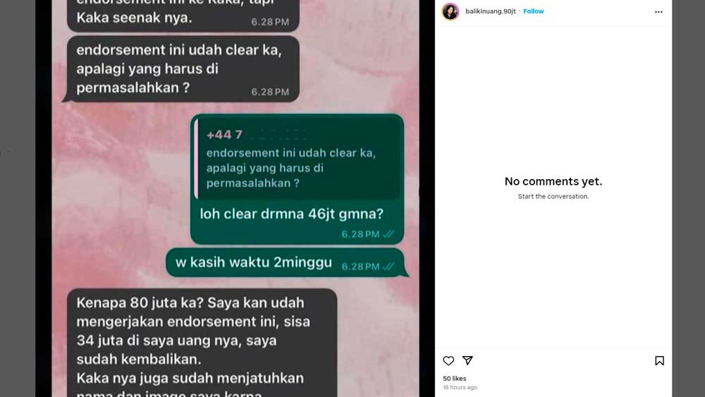 Kabar itu diposting akun Instagram @balikinuang90jt. Akun itu mengunggah diduga bukti chat Loly yang tidak memenuhi kewajiban Endorse padahal sudah di bayar 90 juta.