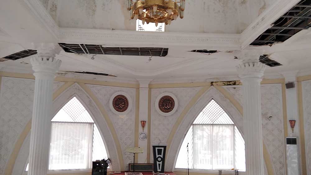 Beberapa bagian bangunan terlihat rapuh dan mulai berjamur. Tak hanya itu beberapa titik langit-langit masjid terlihat berlubang, termasuk juga pada bagian atas mimbar. Kondisi bangunan itu pun dinilai bisa membahayakan jamaah.